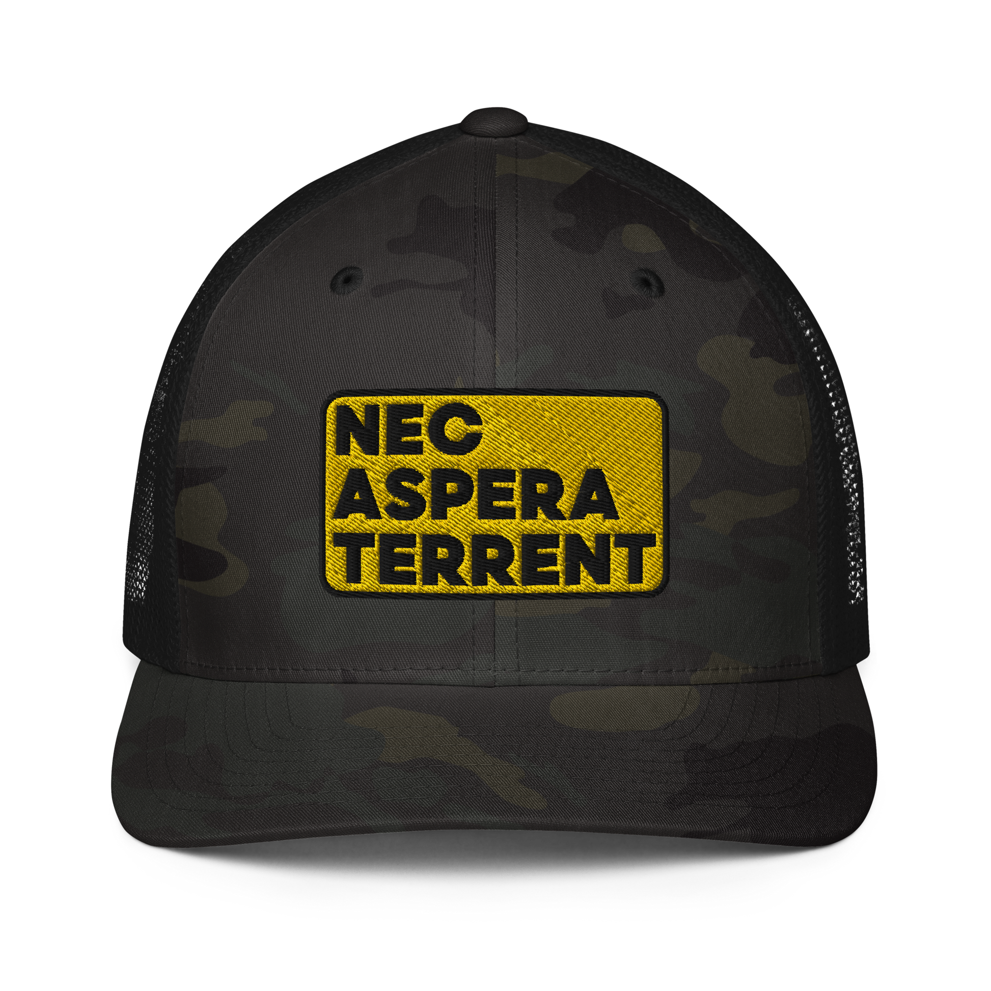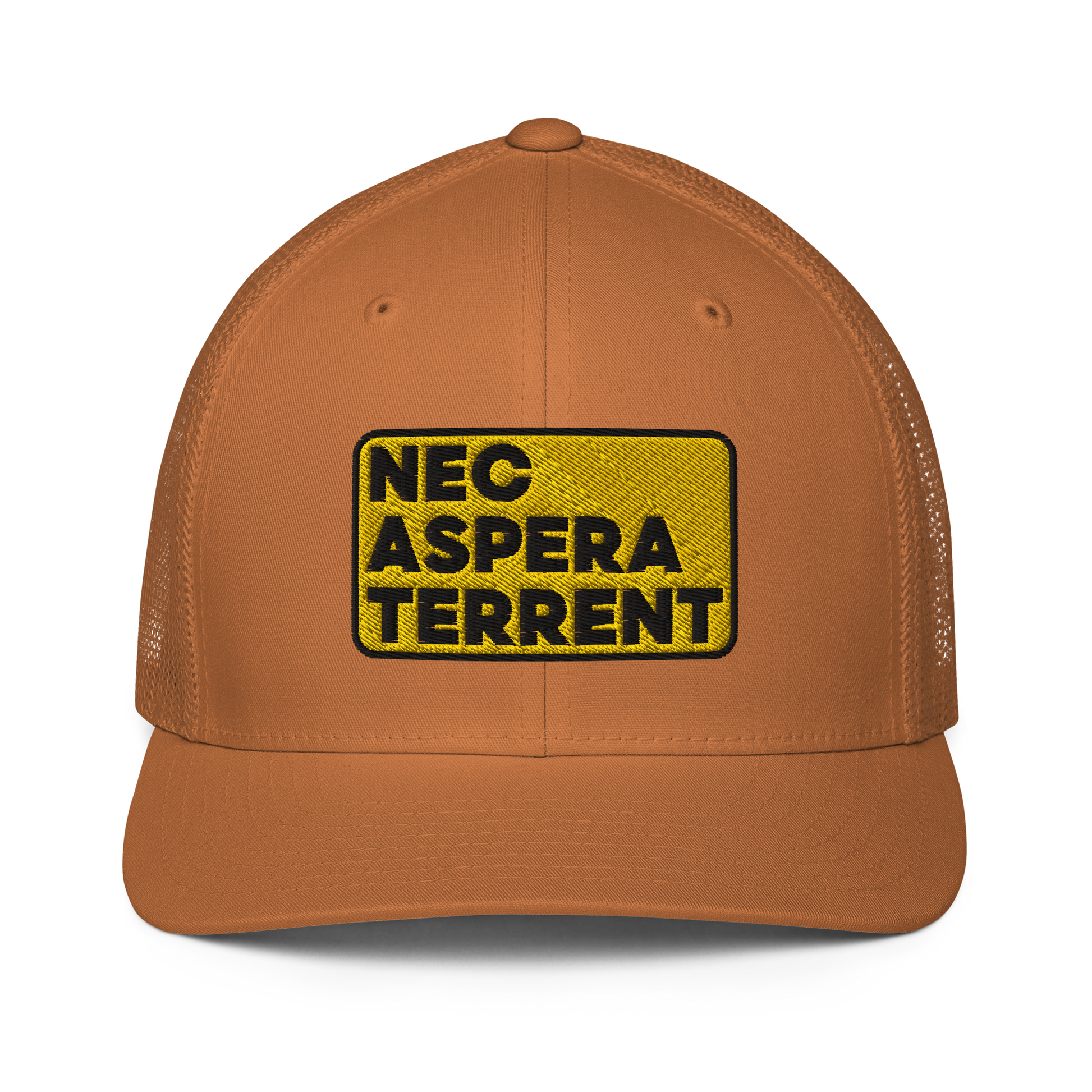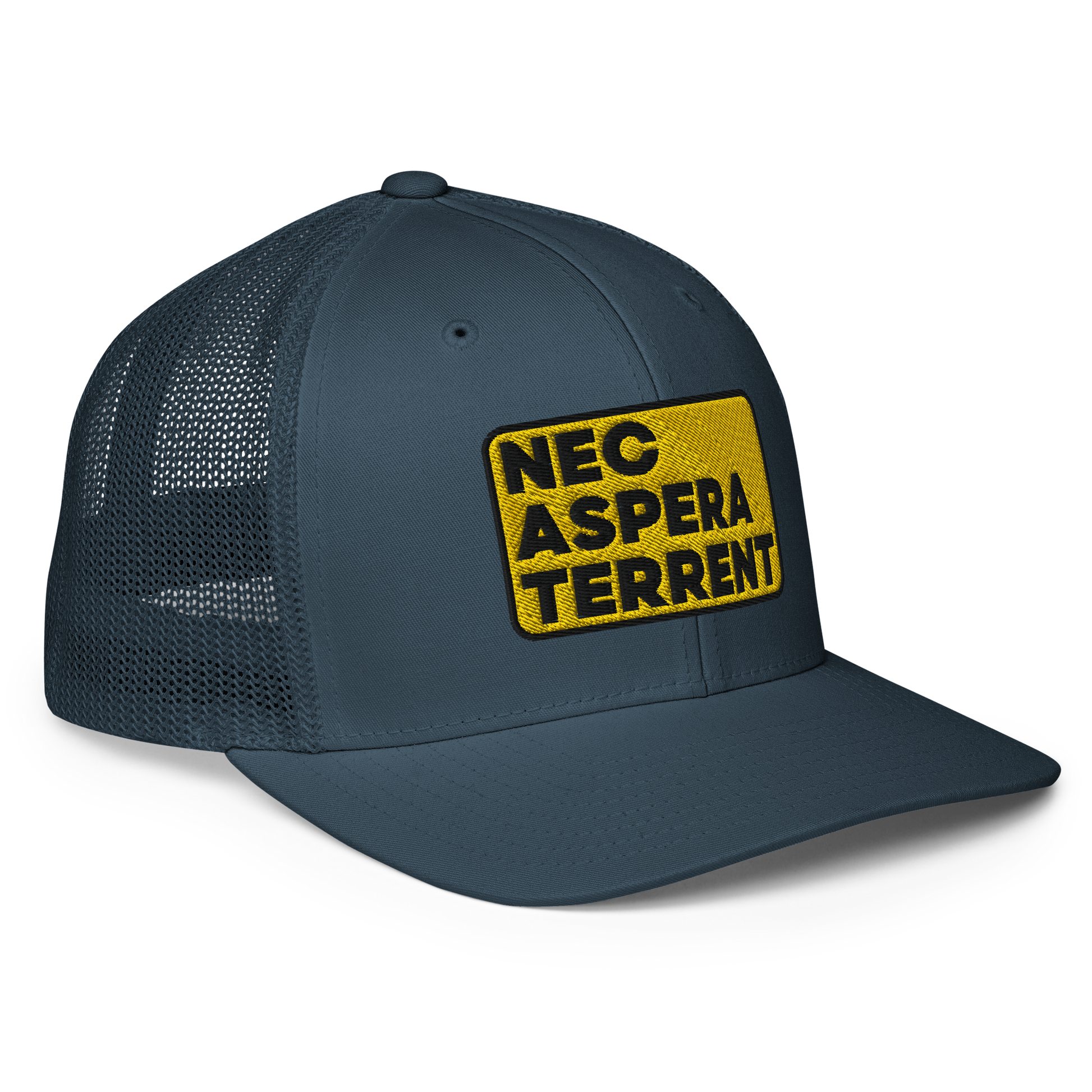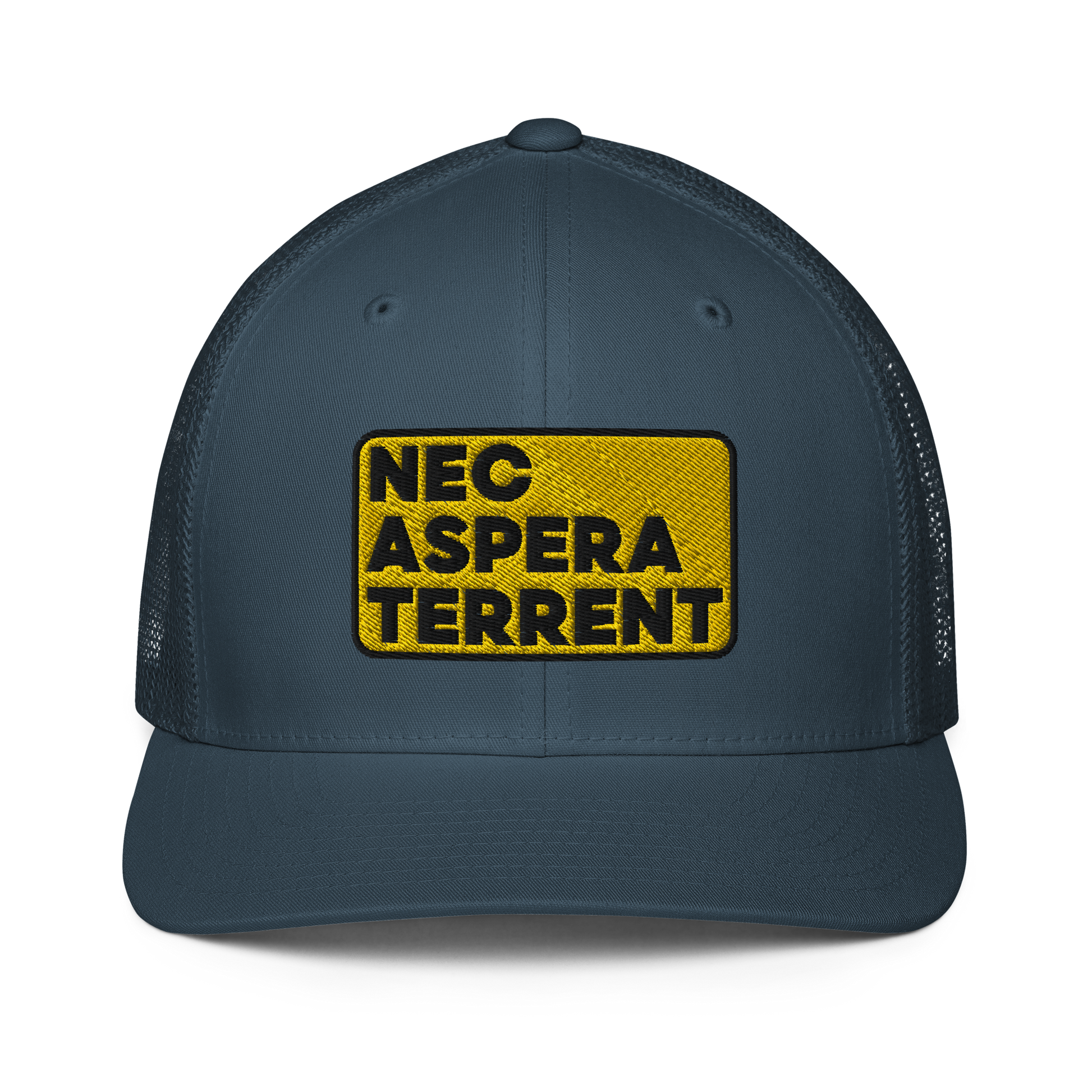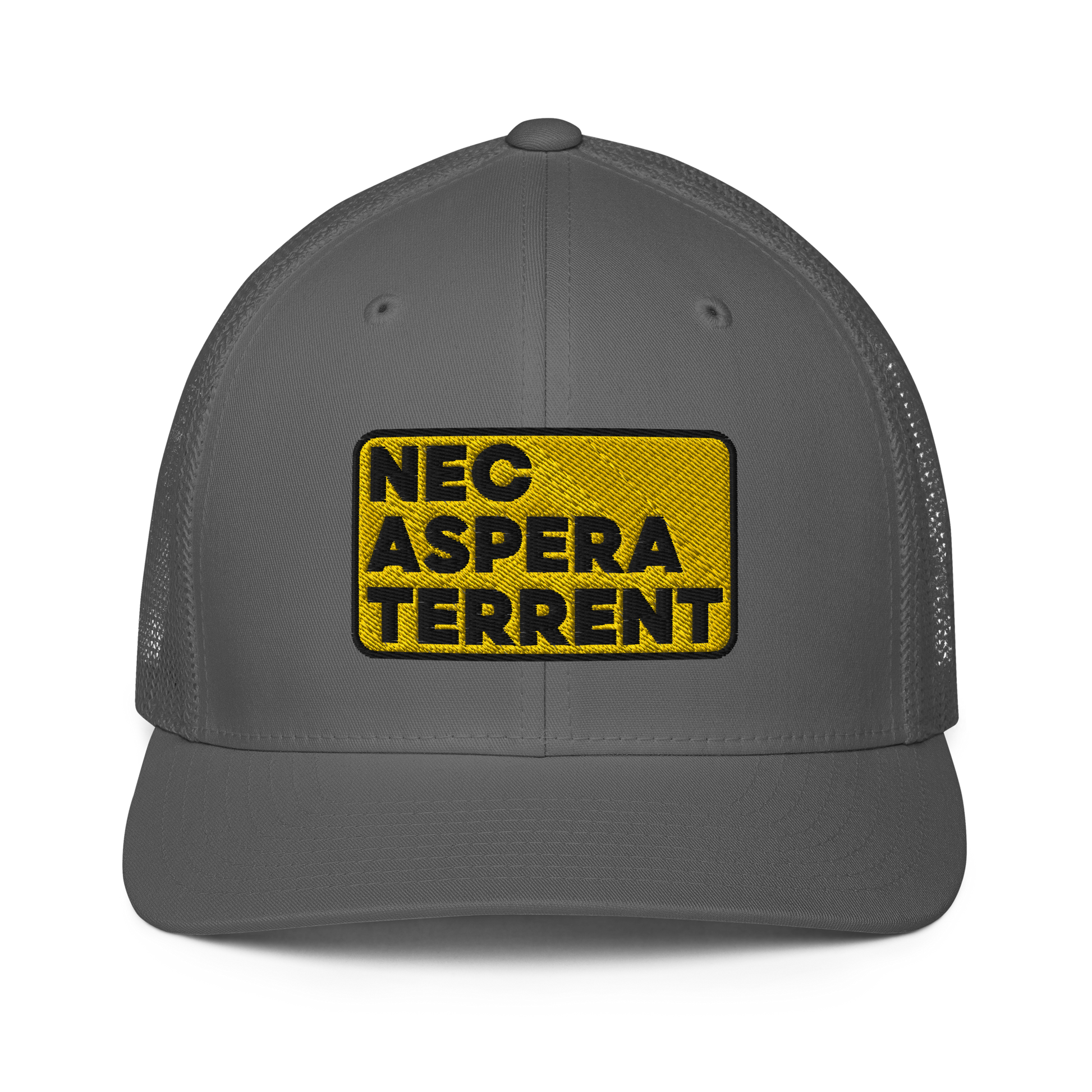 Nec Aspera Terrent, Flexfit closed back trucker hat, one size fits all.