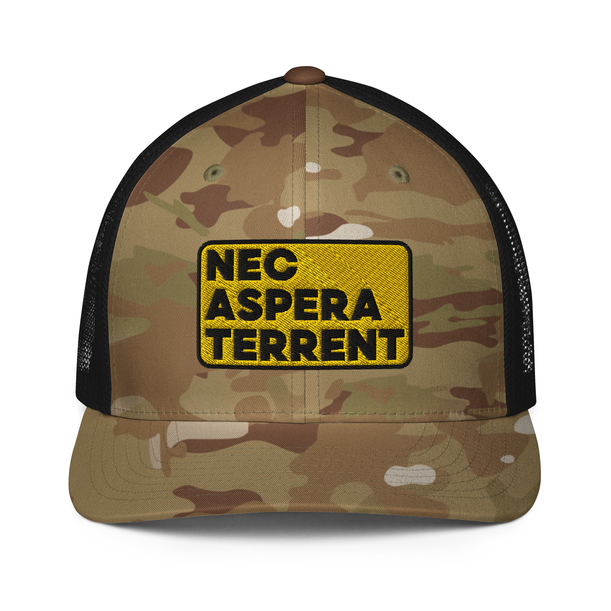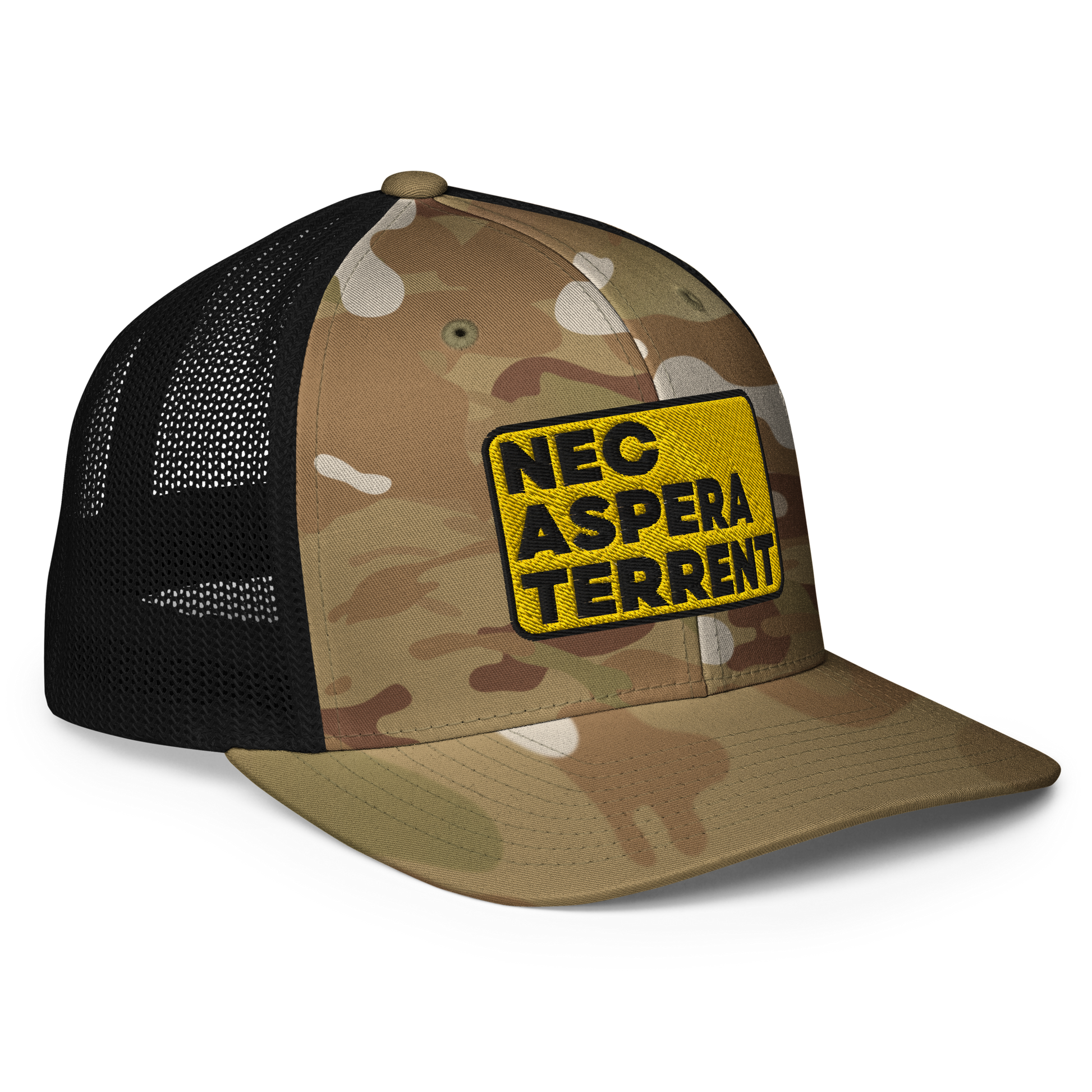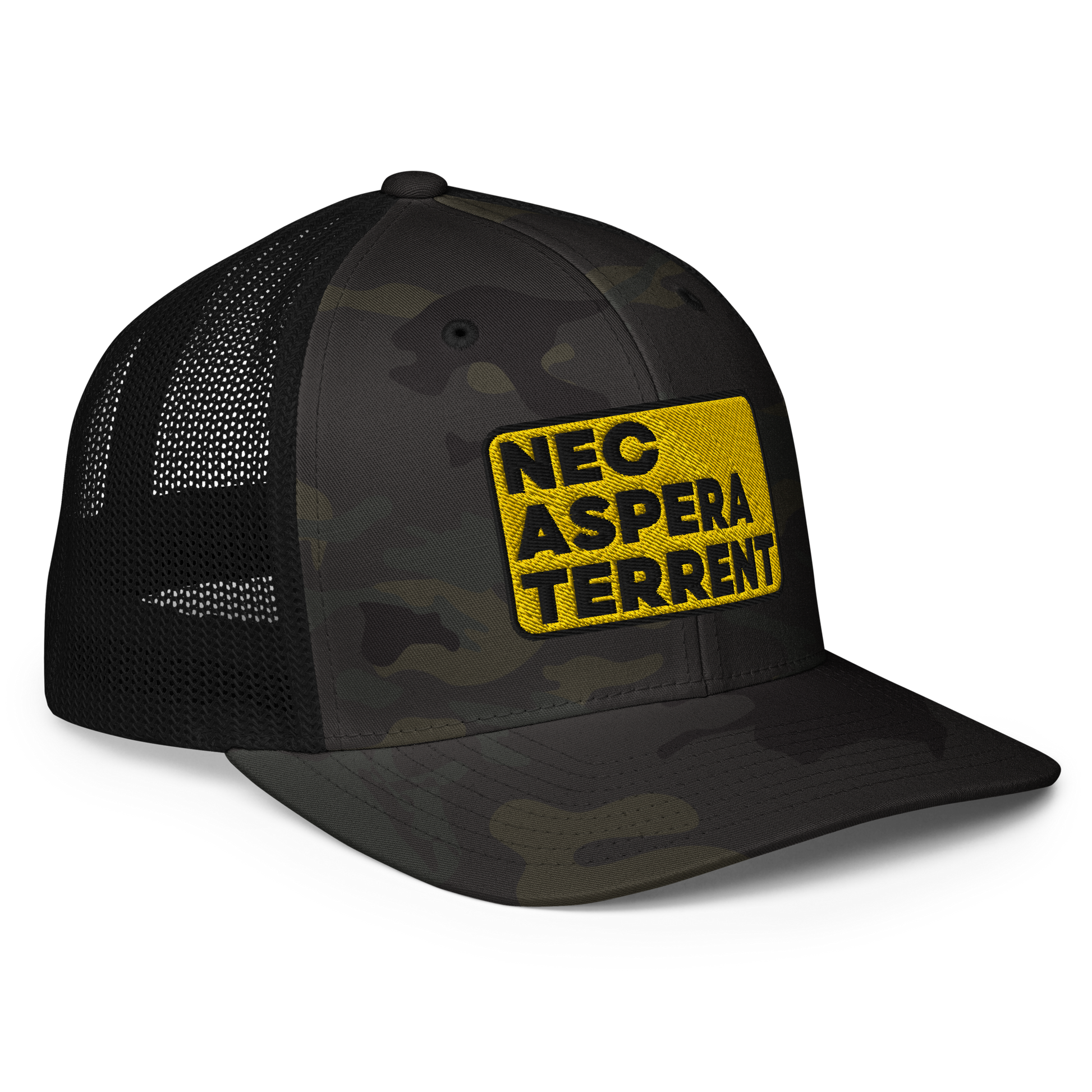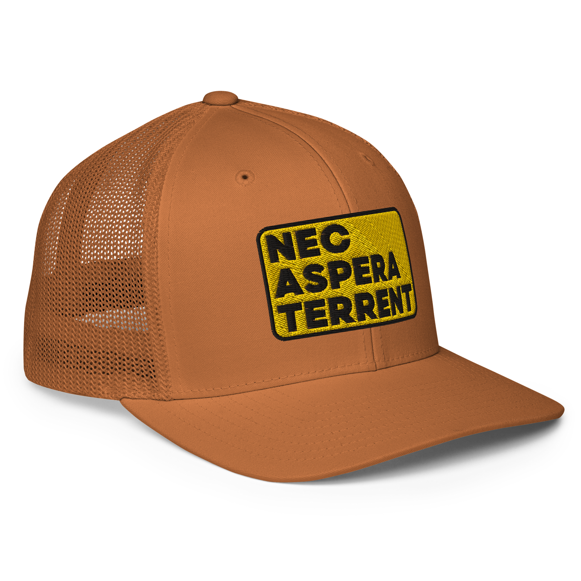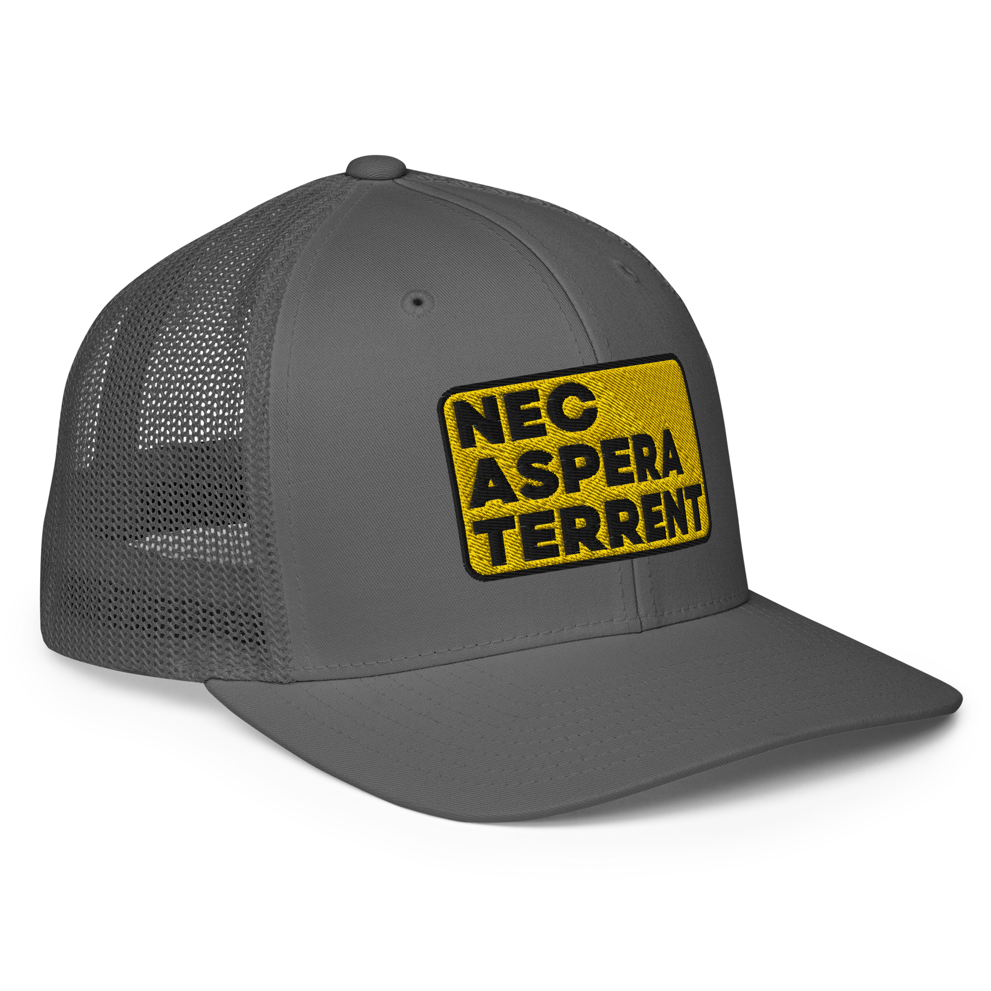 Nec Aspera Terrent, Flexfit closed back trucker hat, one size fits all.